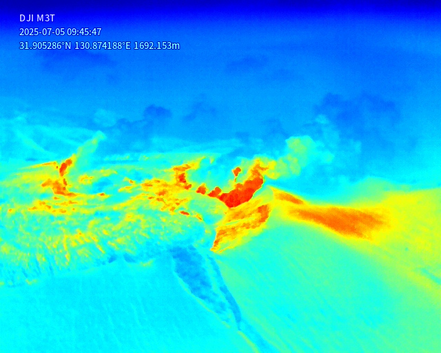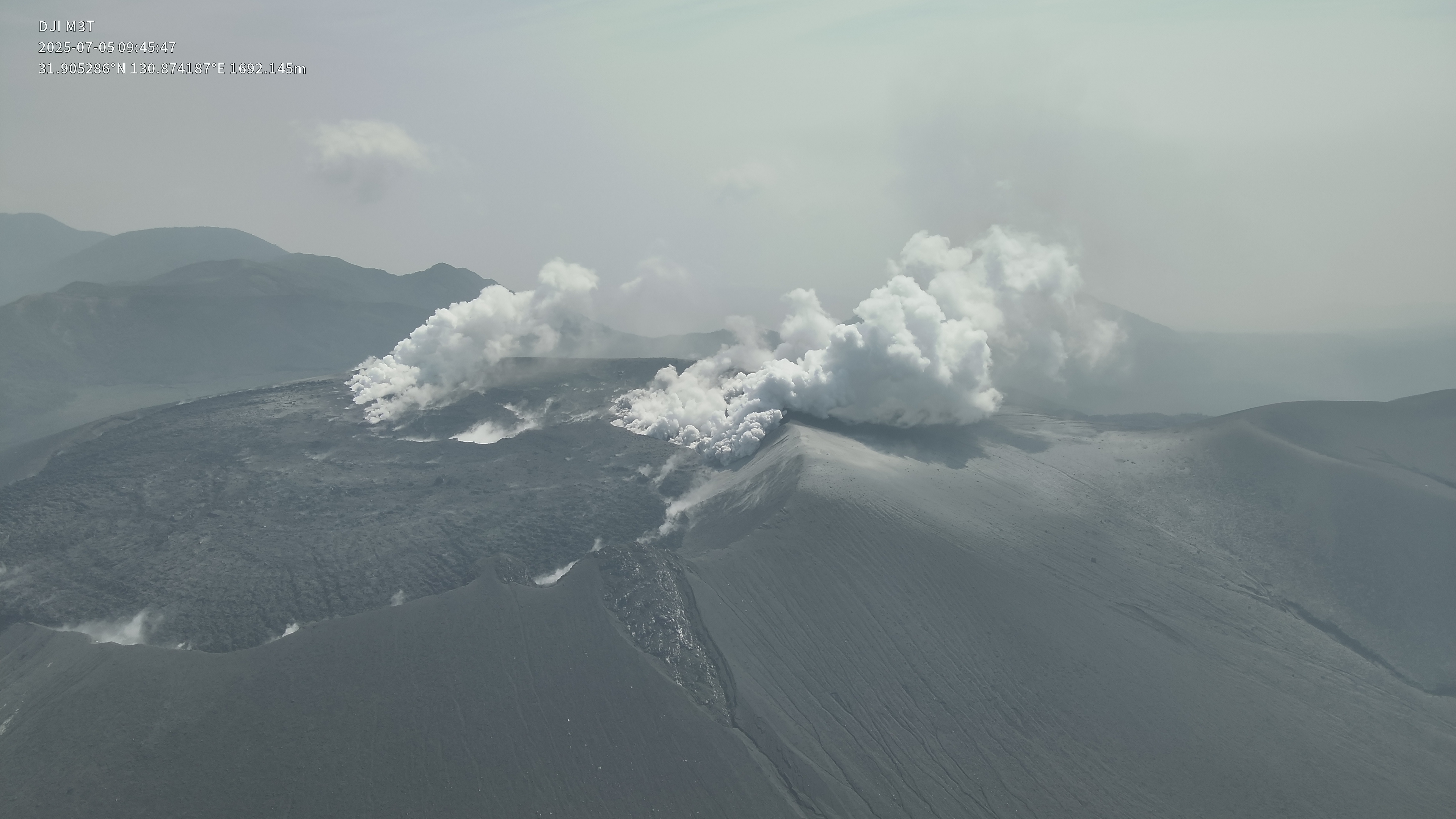 2025年7月5日,噴気・火口状況を確認するために飛行・撮影.噴気の状況が変わり,新たな火孔列ができていることが確認されている.